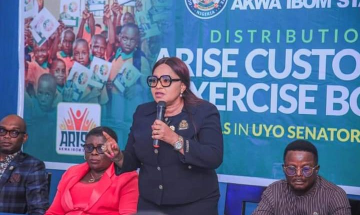 At an event organised by the Akwa Ibom State Ministry of Education for the distribution of ARISE branded exercise books for pupils of all public primary schools in Uyo senatorial district, the State Commissioner for Education Mrs Idongesit Etiebet frowned at acts capable of frustrating the noble intentions of Governor Eno, saying the Governor is committed to ensuring a smooth and efficient education system in public schools in the State.