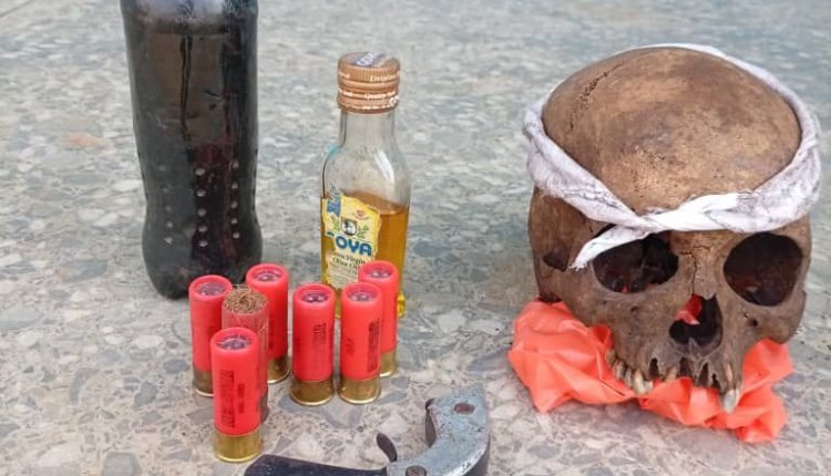 During a search of their hideout, Operatives recovered one locally made short gun, seven live cartridges, one fresh human skull, a bottle containing a substance suspected to be black oil, and a bottle of Guyanese oil, believed to be for ritualistic purposes.